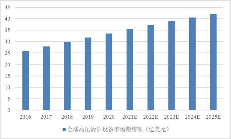全球营收方面,2020年全球高压清洗设备销售规模达到33.6亿美元。随着高压清洗设备的技术和应用不断升级,高压清洗设备的功能不断丰富,设备单价也将逐渐增加。预计到2025年,全球高压清洗设备的市场销售规模有望达到42亿美元。