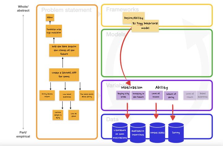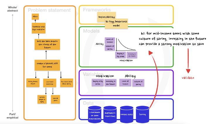 收集的数据是用来基于我们的框架对实际的问题建模。比方说,在我们的例子当中,这会产生一个验证假设。也就是对于具有一定储蓄文化的中等收入青少年来说,投资于未来(而不是拿到钱就想犒劳一下自己,在几周内把钱花掉)可以提供一个强烈的储蓄动机。然后就可以用从调查到模型乃至完整产品等工具来验证这一假设。