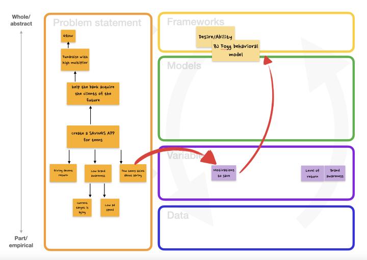 - 项目开展的第二周用来寻找合适的框架去解决问题陈述,同时收集可以告诉我们框架是否有效的数据。换句话说,Priscilla 正在尝试建立一个有效的模型来解决这个问题。正如我们在下面的画布中看到的那样,一个直观的起点是将“子挑战”(妨碍我们解决方案的障碍)转化为我们模型的关键变量。比方说,我们发现青少年典型的短线思维是储蓄app的采用障碍;所以我们知道用户的储蓄动机是问题的关键变量之一。因此,Priscilla通过向自己提问开始启动这个解释循环:对动机建模的框架是什么呢?经过一番思考,她找到了福格(BJ Fogg)的行为模型,这个模型认为,行动是特定动机和能力的结果。