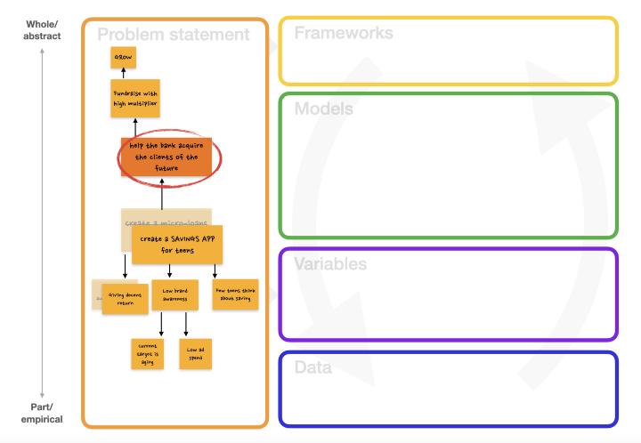 - 基于所有这些信息,在接下来一周的指导委员会会议上,Priscilla 提议对任务简报进行重新语境化,并将问题重新表述为“如何帮助银行赢得未来客户”。其隐含的思考策略如下:鉴于我们的主要挑战在下游存在重大障碍(技术、道德、市场问题);以及事实上,我们的主要挑战不一定就是解决上游目标(赢得未来的客户、以高倍数筹集资金等等)的唯一途径;向上游移动,并将我们的挑战集中在赢得未来客户群这个更具战略性的目标上可能会好一些。Priscilla 和她的团队最后确定,实现这一目标的方法之一是为青少年开发一款储蓄app而不是借贷app。这会引发许多新的子挑战,经过仔细权衡,她们认为与替代方案相比,解决这些挑战的可行性更高一些。