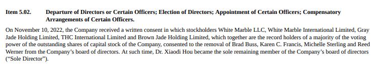 11月10日周四,图森公司收到来自五个大股东的书面文件,正式罢免原五人董事会当中的四人Brad Buss、Karen Francis、Michelle Sterling 和 Reed Werner——只留下侯晓迪一人。