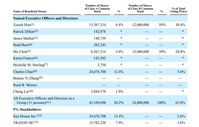 图森提交到 SEC 的最新文件中,列出的5个大股东即是陈默、侯晓迪等人持股的实体。
