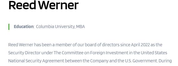 最后一位董事 Reed Werner 的身份更加值得关注:他是前美国国防部负责南亚和东南亚事务的助理副部长,也曾在高盛投行部担任高管,拥有丰富的和中国企业合作的经验。