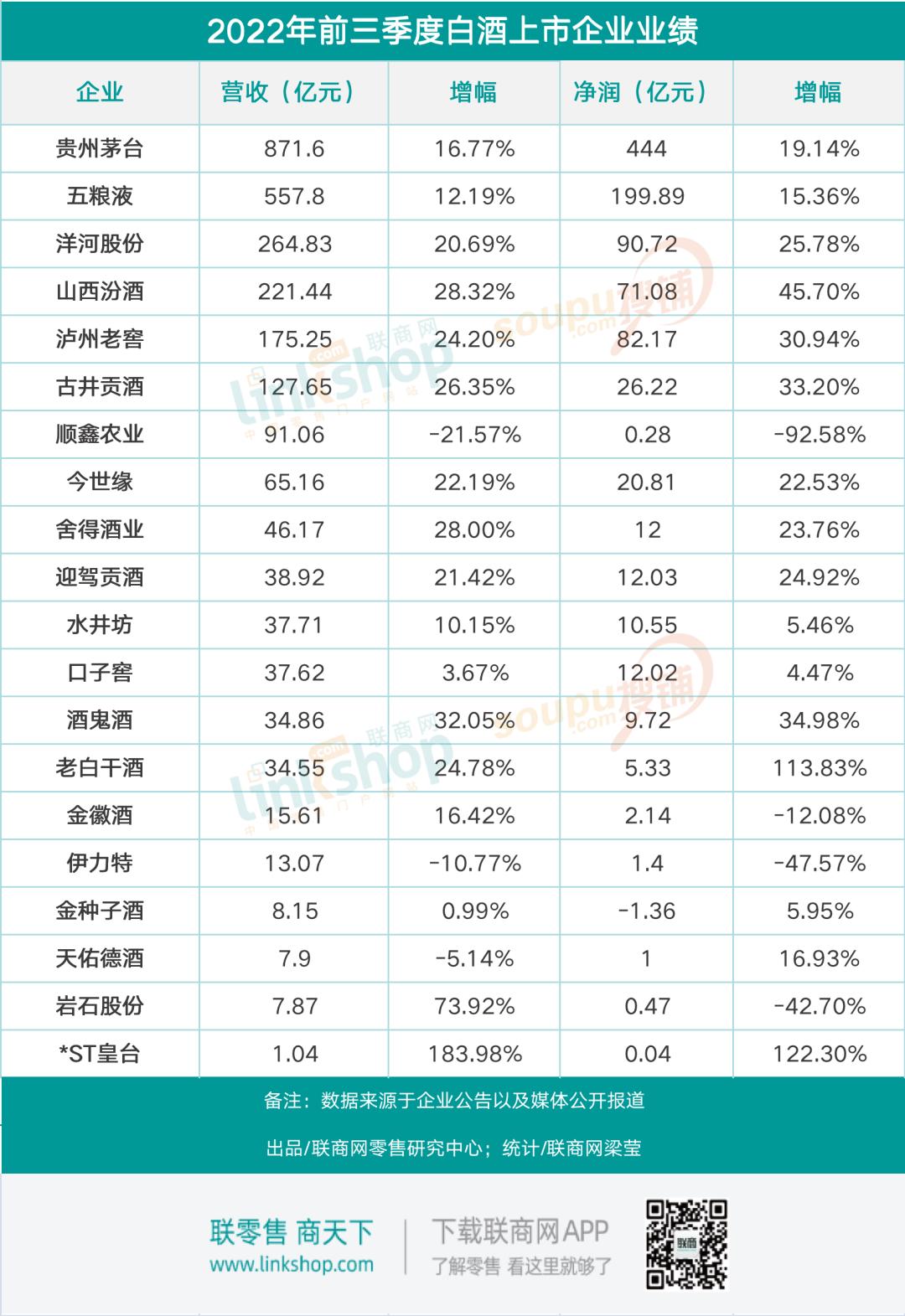 据联商网零售研究中心不完全统计,贵州茅台、五粮液、洋河股份、山西汾酒、泸州老窖、古井贡酒等20家白酒上市企业2022年前三季度营收总额约为2658亿元,平均营收约为133亿元;净利润超过1000亿元。