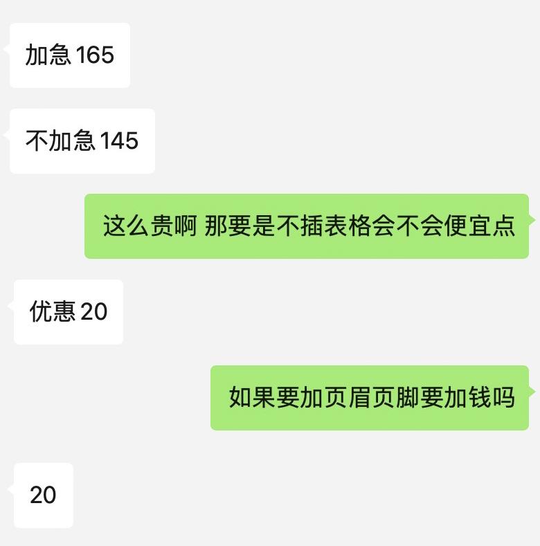 为了摸清行情,我拿出了自己尘封已久的毕业论文随便找了一家淘宝卖家(自认为排版良好)。在添加卖家微信后,对方立刻回复:加急165元不加急145元。一些额外的需求还需要单独付费:页眉20元,表格20元。照这样计算,大学里帮大家调格式的冤种同学简直可以月入上万了。
