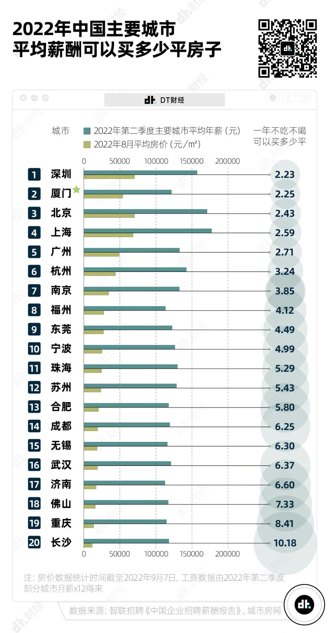 在厦门工作一年,平均只能买2.25平方米的房,而在北京和上海则分别可以买2.43平和2.59平。