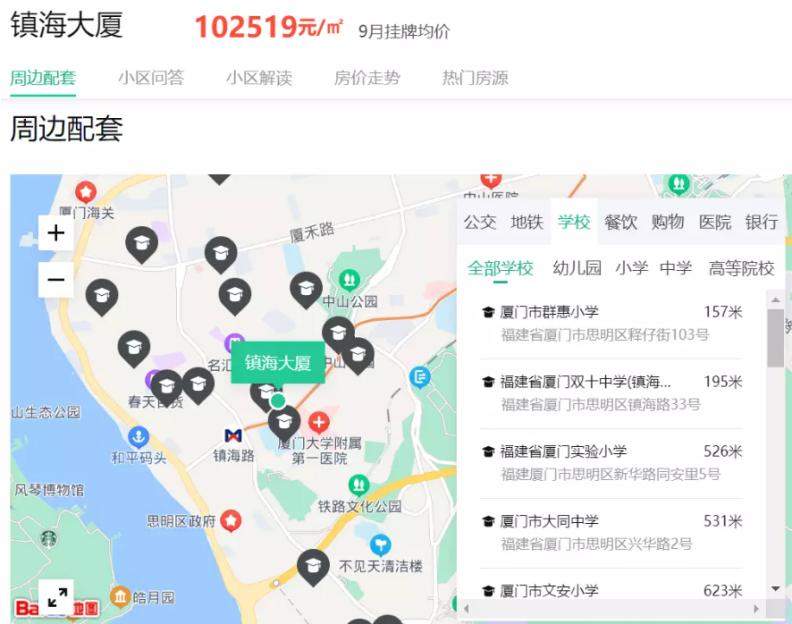 比如镇海大厦小区,因为在厦门最好的小学厦门实验小学附近,再加上毗邻厦门大学附属医院、中山公园等,距离厦门大学思明校区也不到3公里,今年9月的挂牌价就达到了10.25万元/平方米。