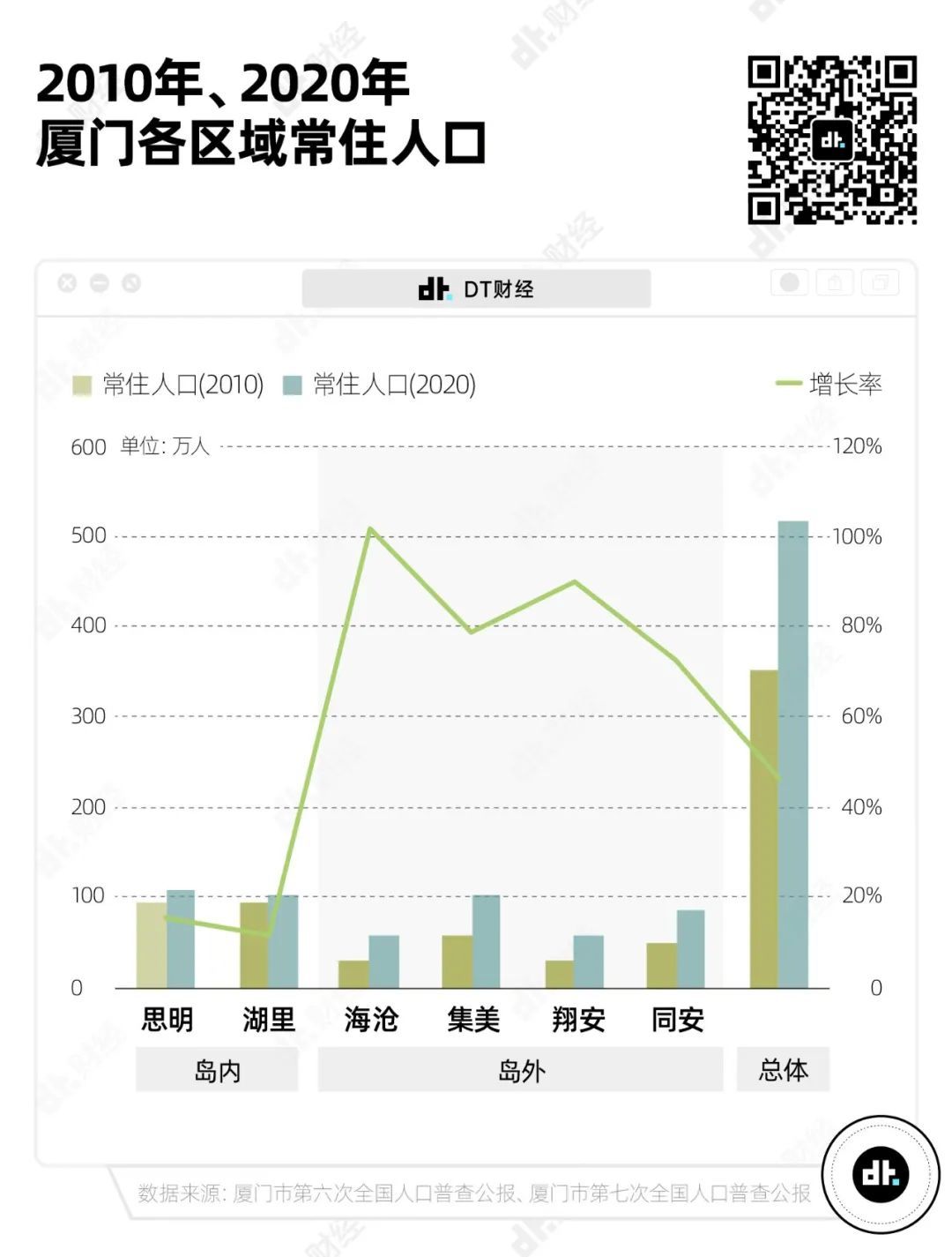 分区域看,虽然岛内常住人口多,但增长缓慢;反而是岛外的几个区人口增长迅速,海沧区增长率达到了101.91%,岛外的其他四个区常住人口增长率也都超过了70%。
