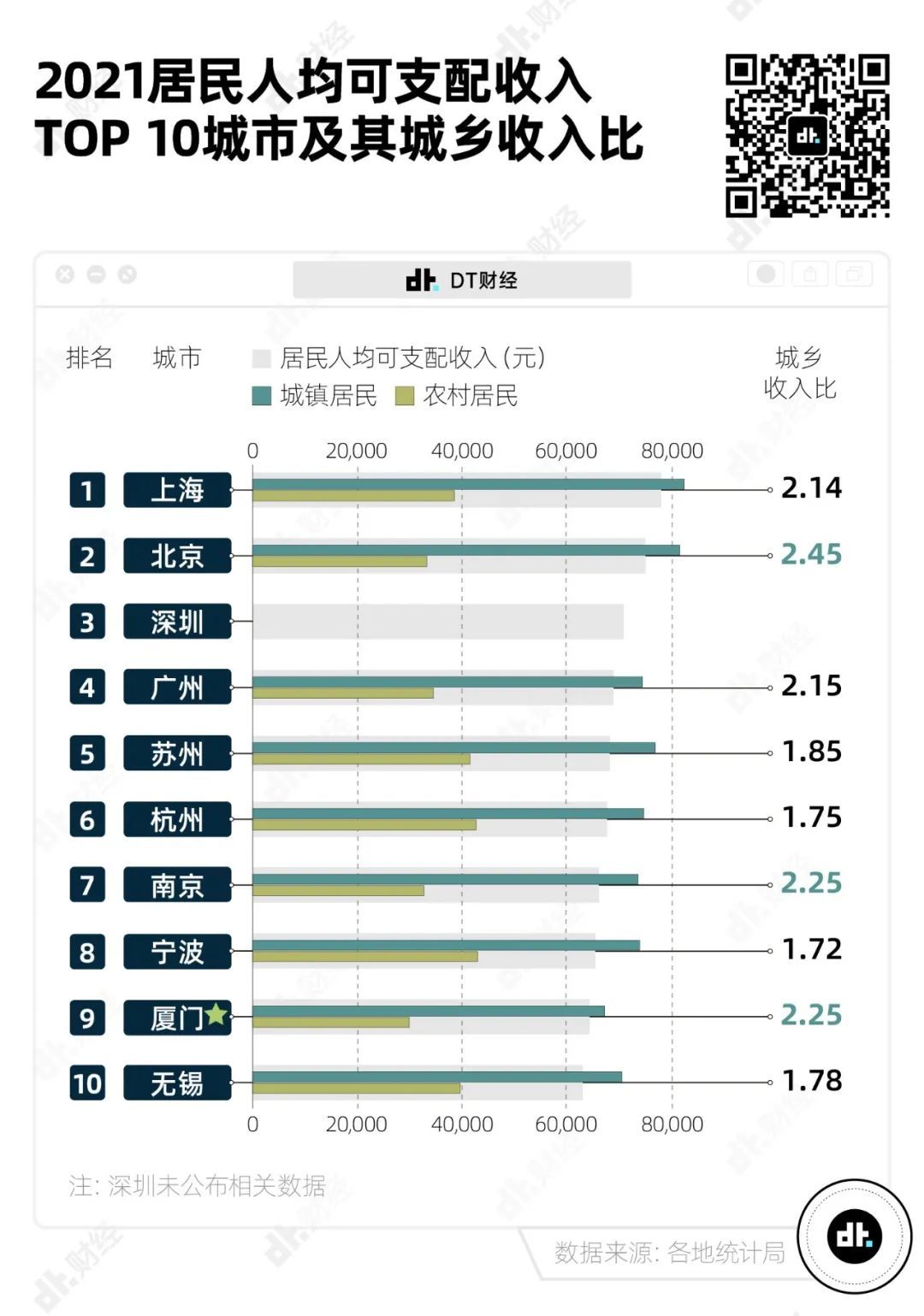 DT财经注意到,虽然2021年厦门的居民人均可支配收入并不算低(64362元,全国排名第九),但厦门与南京并列,是除了北京之外城乡收入比最高的城市,达到了城市收入:农村收入=2.25:1。