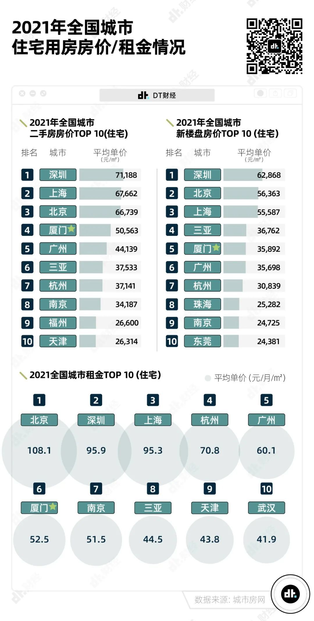 根据城市房网的数据,2021年,全国城市二手房房价TOP10中,厦门排名第四,仅次于深圳、上海和北京。新楼盘房价排名第五,仅次于一线城市深圳、北京、上海和热门旅游城市三亚。