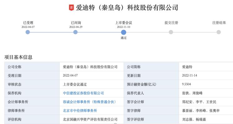 11月10日,爱迪特上会,创业板上市委公告称,爱迪特(秦皇岛)科技股份有限公司(首发)符合发行条件、上市条件和信息披露要求。11月14日,爱迪特过会并更新了创业板IPO招股书。
