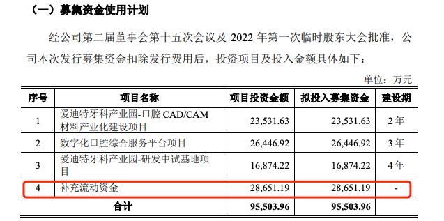 招股书显示,爱迪特累计募集资金9.55亿元,拟投资于爱迪特牙科产业园-口腔CAD/CAM 材料产业化建设项目、数字化口腔综合服务平台项目、爱迪特牙科产业园-研发中试基地项目和补充营运资金。