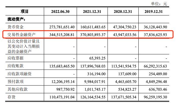从招股书披露信息来看,2019年-2022年上半年,公司交易性金融资产账面价值分别为3783.66万元、4394.7万元、3.71亿元和3.45亿元。