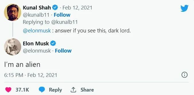 “我是个外星人。”(I’m an alien.) /推特@elonmusk