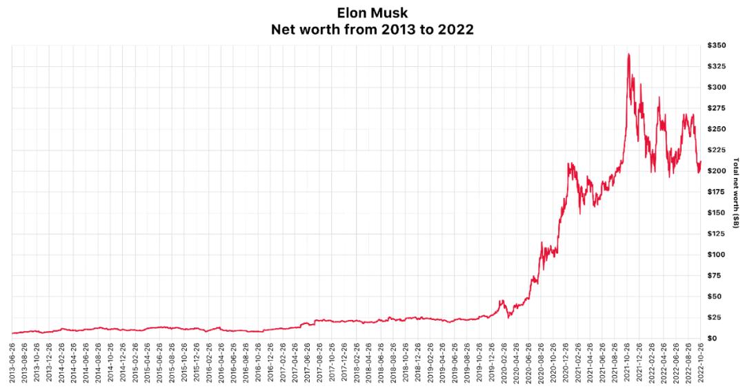 《福布斯》 杂志估算的埃隆·马斯克 2013 年至 2022 年的净资产。/Wiki
