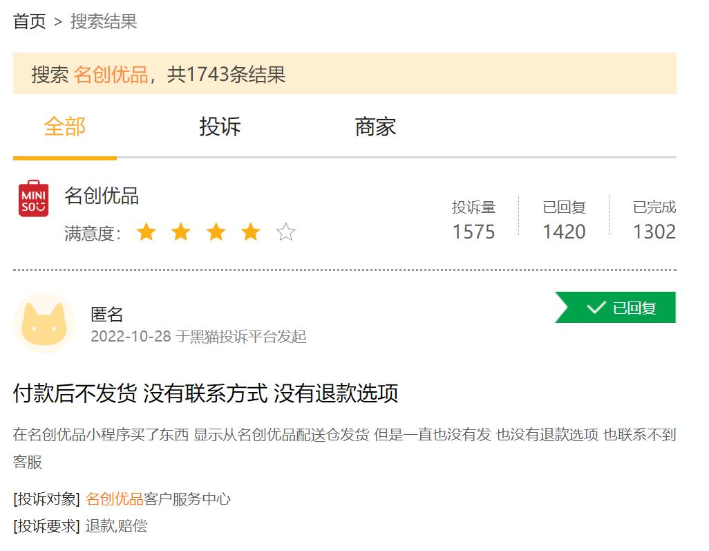 在黑猫投诉平台上输入关键词“名创优品”,瞬间弹出了1700多条相关投诉,放眼望去可谓满目疮痍。其中,有大量针对产品质量的投诉,比如有用户表示名创优品购买的杯子异味严重,“客服说用几天就没味了,但用了一个月还是这样,结果不给退换了”。