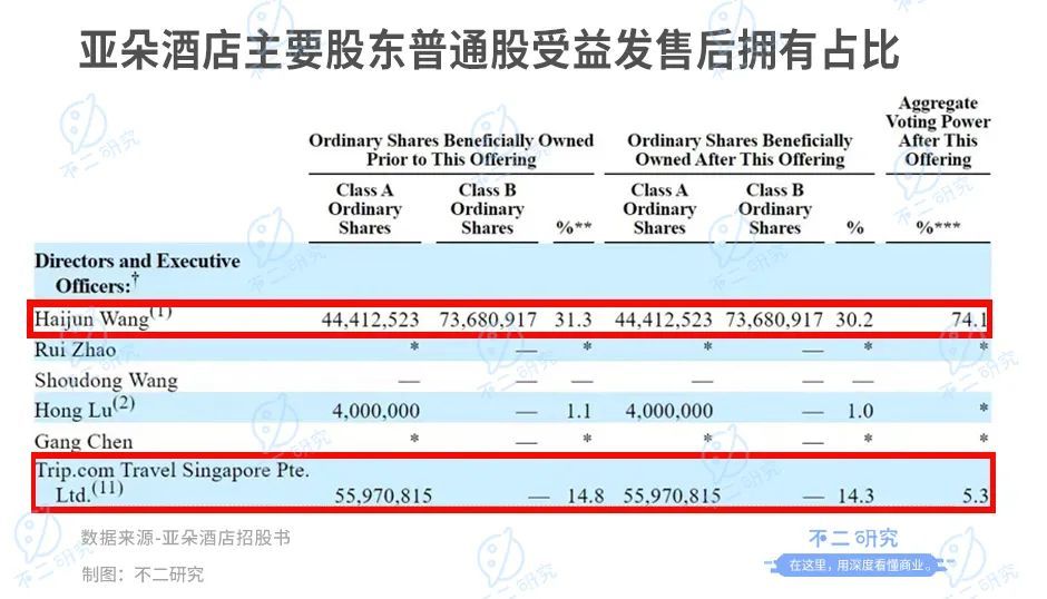 据招股书披露,王海军(即耶律胤)持股32.2%,为亚朵的第一大股东;携程集团持股14.3%,为其第四大股东。