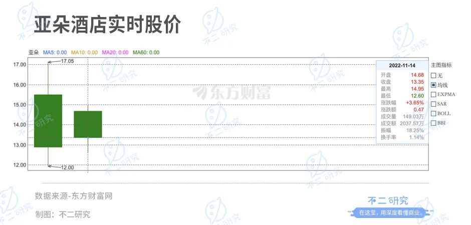 亚朵此次IPO募资总额为5225万美元,发行475万股ADS,发行价为11美元/ADS,开盘价为15.50美元/股。上市首日,亚朵报收12.88美元/股,较开盘价上涨17.09%,对应市值16.8亿美元(折合人民币约118.12亿元)。