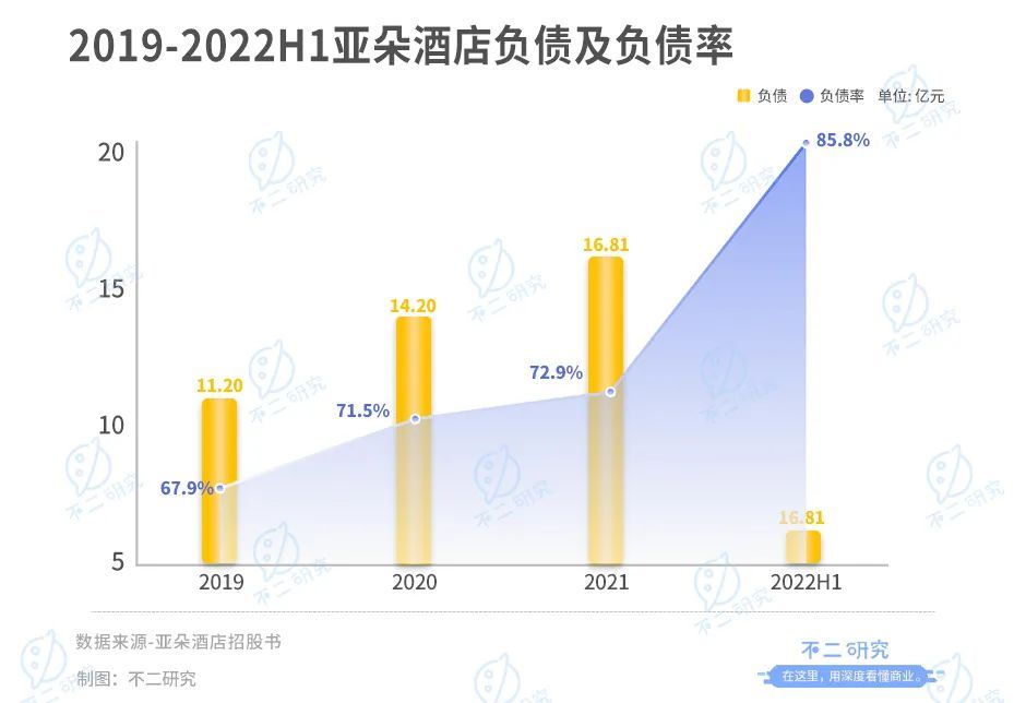 「不二研究」发现亚朵的负债情况并未好转:2019-2022上半年,其总负债分别为11.20亿、14.20亿、16.81亿和5.57亿;同期,其负债率高达67.9%、71.5%、72.9%和85.8%。