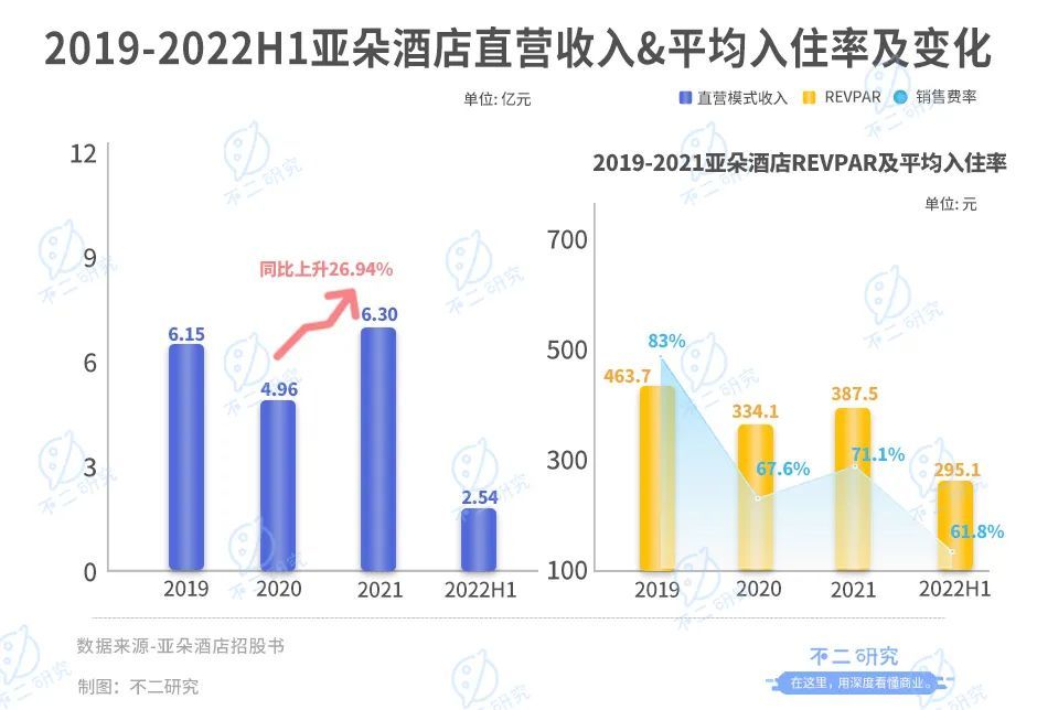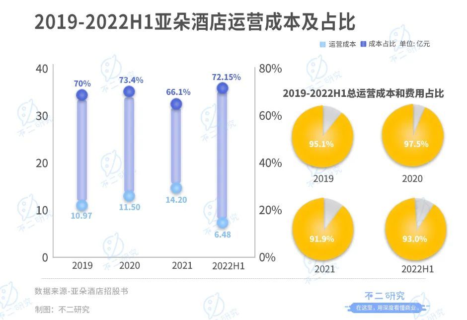 「不二研究」发现,2019年,亚朵的酒店运营成本高达10.97亿,总营收占比70%;2020年达11.50亿元,占亚朵总营收的73.4%。这一占比在2021上半年也未能有明显好转,运营成本6.48亿元,依旧高达72.15%。