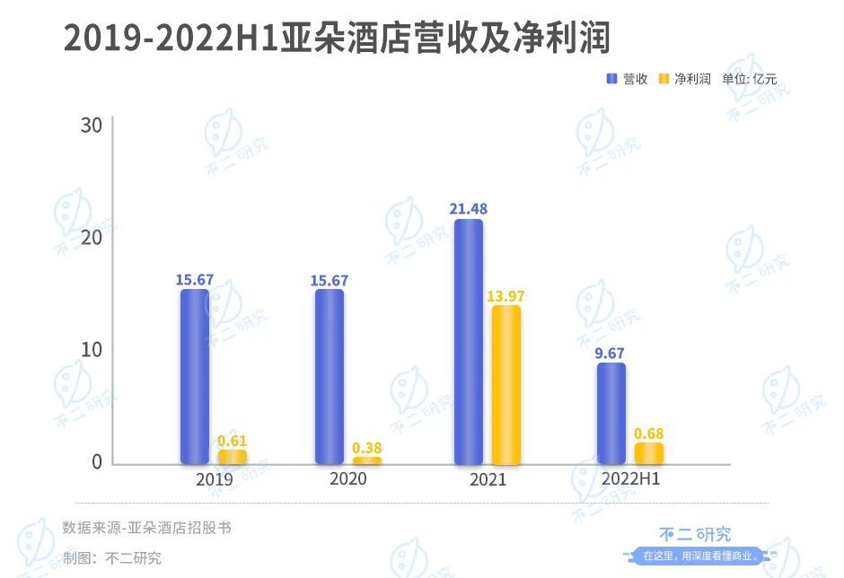 招股书显示,亚朵酒店2019年、2020年的营收分别为15.67亿元、15.67亿元,基本持平;2021年,其营收21.48亿元,同比增长37.09%。2022上半年,其营收为9.67亿元。