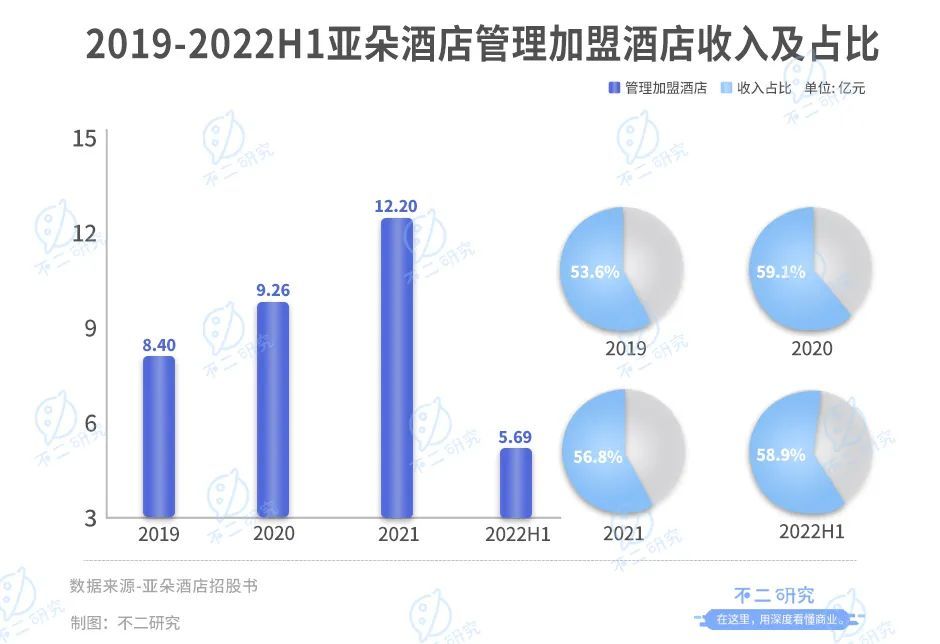具体来看,管理加盟酒店收入是其营收支柱,在总营收占比一半以上。2019-2022上半年,来自管理加盟酒店收入分别为8.40亿、9.26亿、12.2亿和5.69亿,占总营收比例分别为53.6%、59.1%、56.8%和58.9%。