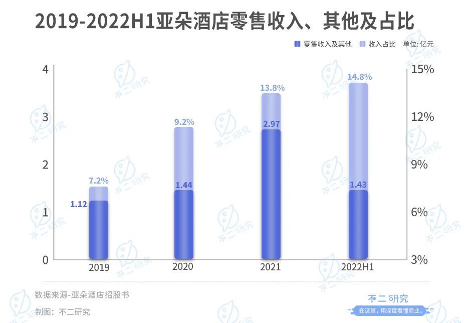在加盟和直营酒店业务以外,亚朵推出基于场景的零售业务。2019-2022上半年,其零售收入及其他分别为1.12亿、1.44亿、2.97亿和1.43亿,总营收占比7.2%、9.2%、13.8%和14.8%。