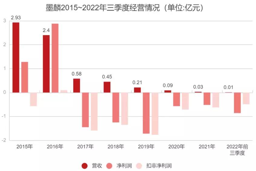 从2015年开始墨麟有了走下坡路的趋势。最直观的表现就是营收逐年下滑,2020年跌至百万元量级;净利润也连续六年为负数,累计亏损超过6亿元。今年的财报依旧惨淡,前三季度勉强入账100万元,亏损则来到8000多万元。