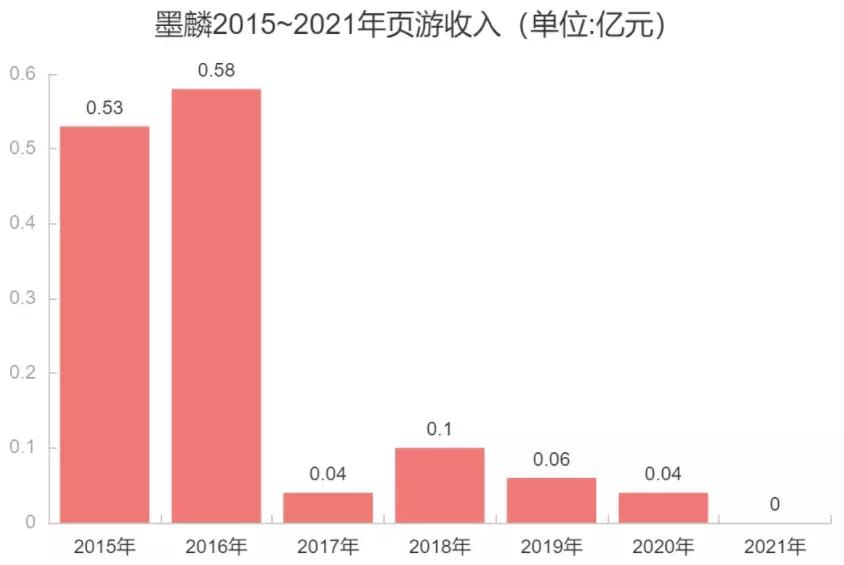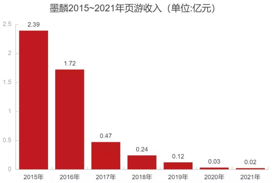 最终导致墨麟的页游收入逐年减少,2017年收入从上亿元掉到5000万元以下,2021年仅剩200多万,与巅峰时期的4亿多相去甚远。对应的市场份额也不断缩小,2015年它跌出中国页游研发商排行榜TOP3,之后慢慢消失在榜单上,连带着陈默也低调起来,鲜少出席各大论坛。