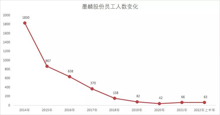 期间墨麟的人员规模不断缩水,2015年优化接近一半来到867人,之后几乎每年都在收缩,2019年精简至百人以内,近两年则稳定在60多人。