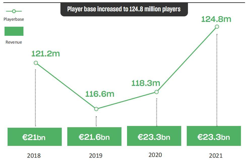 欧洲互动软件协会和欧洲游戏开发者协会在联合发布的报告中显示,2021年欧洲游戏收入也只有233亿欧元(按当前汇率计算约为241.4美元),与2020年持平。与之相对的是,2021年欧洲游戏玩家数量从2019年的1.12亿增长至1.25亿,半数的欧洲人认为自己是游戏玩家,游戏影响力持续增加。Laurence Farreng在发言中表示:“对于过半的欧洲人来说,电子游戏是他们文化生活的重要组成部分。”