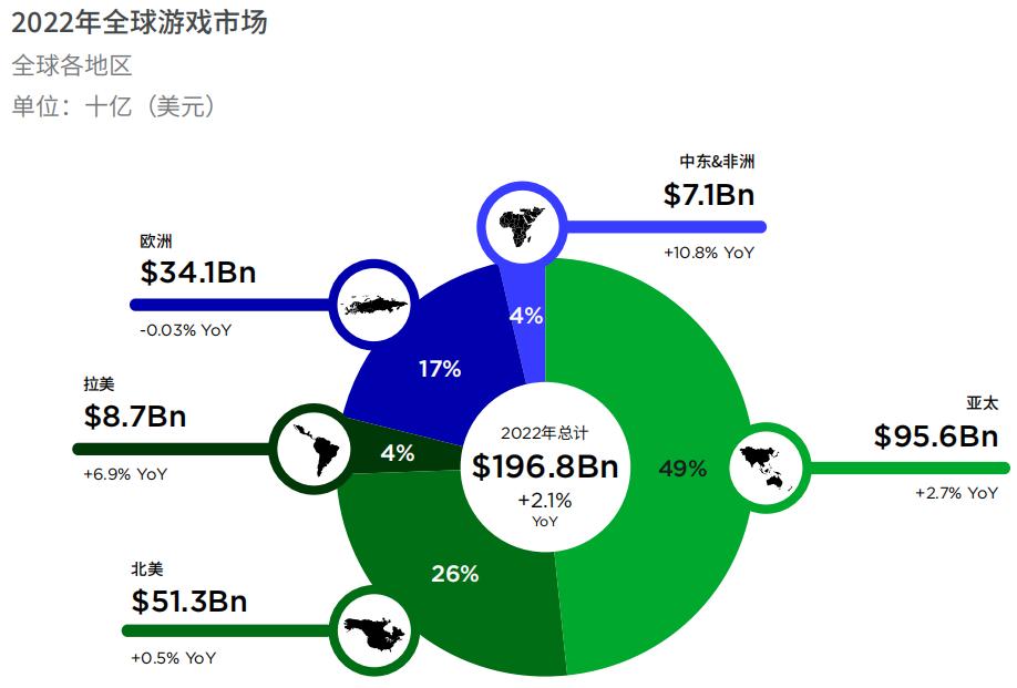 他同时提出:“直到今日,欧盟对这一领域都缺乏展望和视野。”事实上,在全球游戏市场格局中,欧洲的地位一直处在“高不成低不就”的位置。数据机构Newzoo《2022年全球游戏市场报告》显示,2022年全球游戏市场1968亿美元的份额中,亚太地区和北美地区分别占49%和26%,欧洲市场份额仅为17%,约341亿美元。