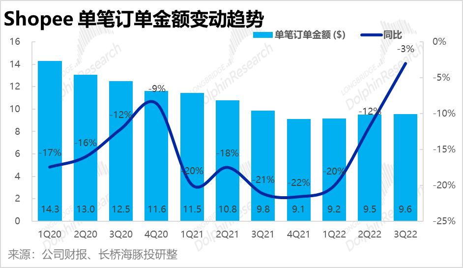 从价量驱动角度,由于公司基本退出了核心东南亚各国和巴西以外的其他全部市场,本季Shopee订单量与上季一致同样在20亿单,可见订单量是GMV停止增长的主原因。价的角度,在摆脱了新兴市场的低客单价拖累后,Shopee整体的客单价在持续回升,本季达到9.6美元,较最低点已提升了50美分。后续随着Shopee继续深耕核心市场应当还有继续提升的空间。