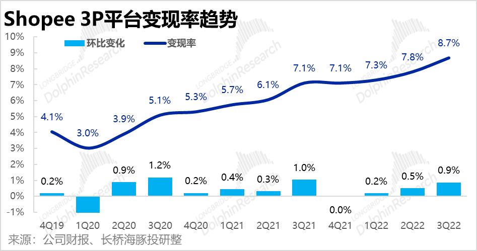 2.Shopee电商增长停滞但超预期减亏:由于公司退出除巴西和东南亚以外的其他全部市场,且完全转向利润重心,本季Shopee的GMV为191亿元,环比上季度基本0增长。但在变现率由7.8%大幅提升到8.7%的帮助下,电商业务营收仍有32%的增长。且实际19.2亿的营收也好于市场预期的18.7亿。并且,以佣金和广告收入为主的“有效变现”本季增长了50%以上,高于”无效变现”的代收物流费增速。优质 变现 的提升也意味着电商板块的利润会显著改善。