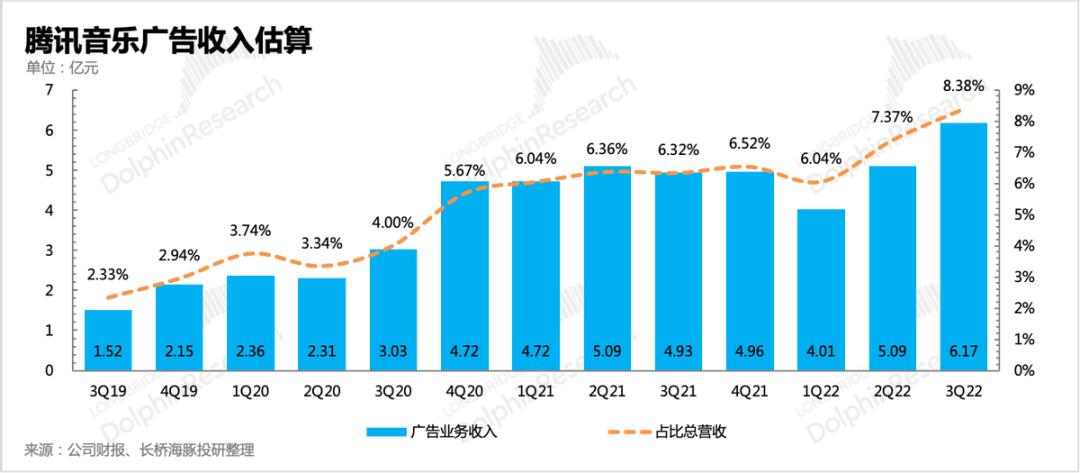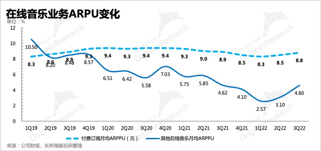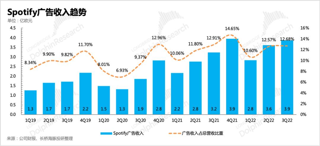 目前来看,广告带来的增量暂时顶住了大部分的压力。尤其是去年下半年推出的“看广告免费听歌”的功能应该进展不错,上季度管理层也提及目前广告收入中10%为该项功能贡献。参照Spotify,海豚君预计这些广告收入未来将会促进更多的白嫖用户成为广告受众用户,以及在经济好转时,这些广告用户也更容易被转化为订阅付费用户。