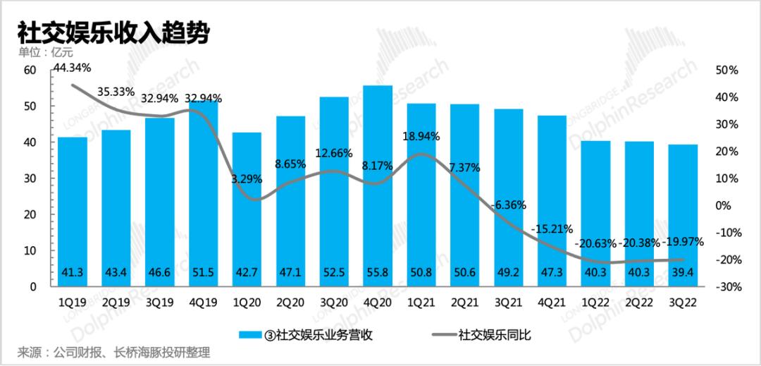2、社交娱乐单季收入则继续近三年内创新低,只有39.4亿,在基数降低下继续同比下滑20%。这项业务受到短视频的直接竞争影响,尤其是直播业务,对外几乎没有多少招架之力,只有通过公司生态内循环来减少流量的直接流失。