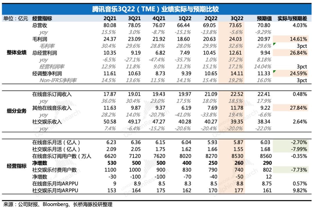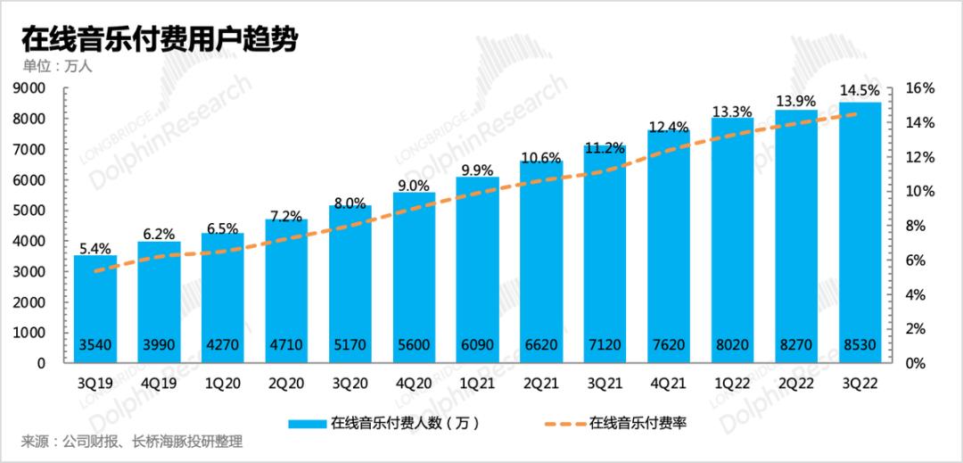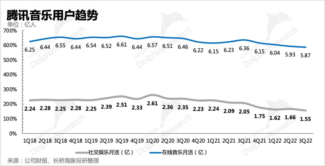 社交娱乐的用户流失是在短视频等其他泛娱乐平台的竞争下,公司基本无力抵抗的结果。但三季度在走出上海疫情之后,一向坚挺的在线音乐订阅用户净增也没有回到年初给的指引300-400万区间,则恐怕更多的是受到宏观经济的持续低迷拖累。毕竟对于核心用户来说,腾讯音乐的曲库优势仍然显著。