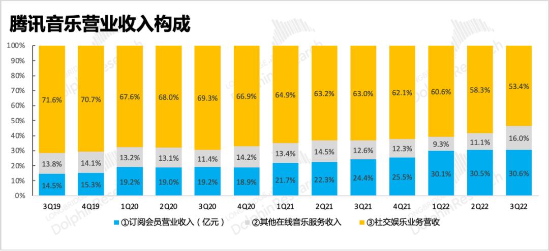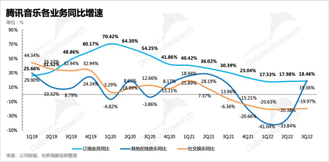 社交娱乐一直是腾讯音乐的业绩支柱,尽管已经萎靡了一年多,但截至三季度,社交娱乐的收入仍然占了总营收的53%。因此短期内社交娱乐的滑坡,对腾讯音乐的收入端会造成不小的压力。