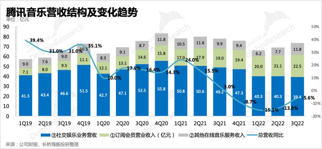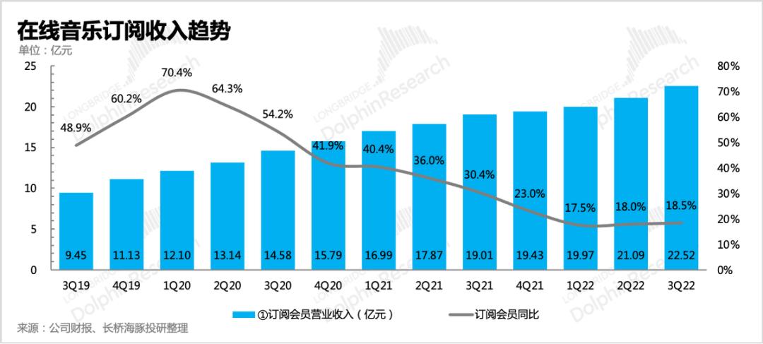1、在线音乐收入34.4亿,同比增长18.8%。包含了22.5亿的订阅会员收入,和11.78亿的其他在线音乐收入(QQ音乐广告、数字专辑销售、版权分销等)。