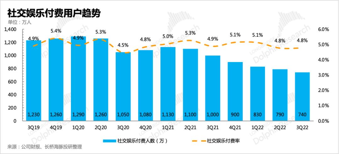 广告收入虽然能够在短期内弥补社交娱乐的持续走低,但作为仍然占比50%以上的社交娱乐,在面对短视频竞争招架无力未来可能还将下滑的情况下,光靠广告可能补不了全部的缺口: