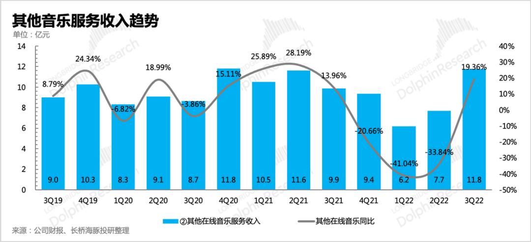 2)其他在线音乐收入所包含的业务,去年三季度或多或少都在经历逆风,App开屏广告整顿、粉圈文化规范(粉丝购买专辑数量设上限,减少刷榜行为),以及从独家版权松绑对版权分销的影响,从而造成去年基数较低。