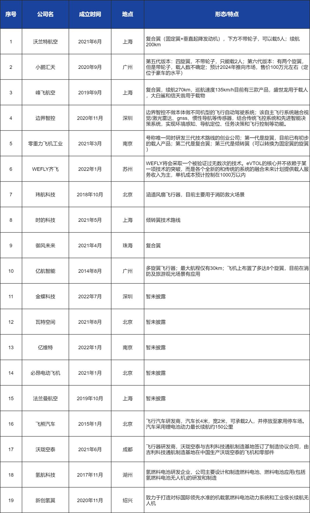 国内值得关注的创新公司有:沃兰特航空 (复合翼) 、零重力飞机工业 (倾旋翼方案,同时有前两款技术积累) 、时的科技 (倾旋翼) 、WEFLY齐飞等。