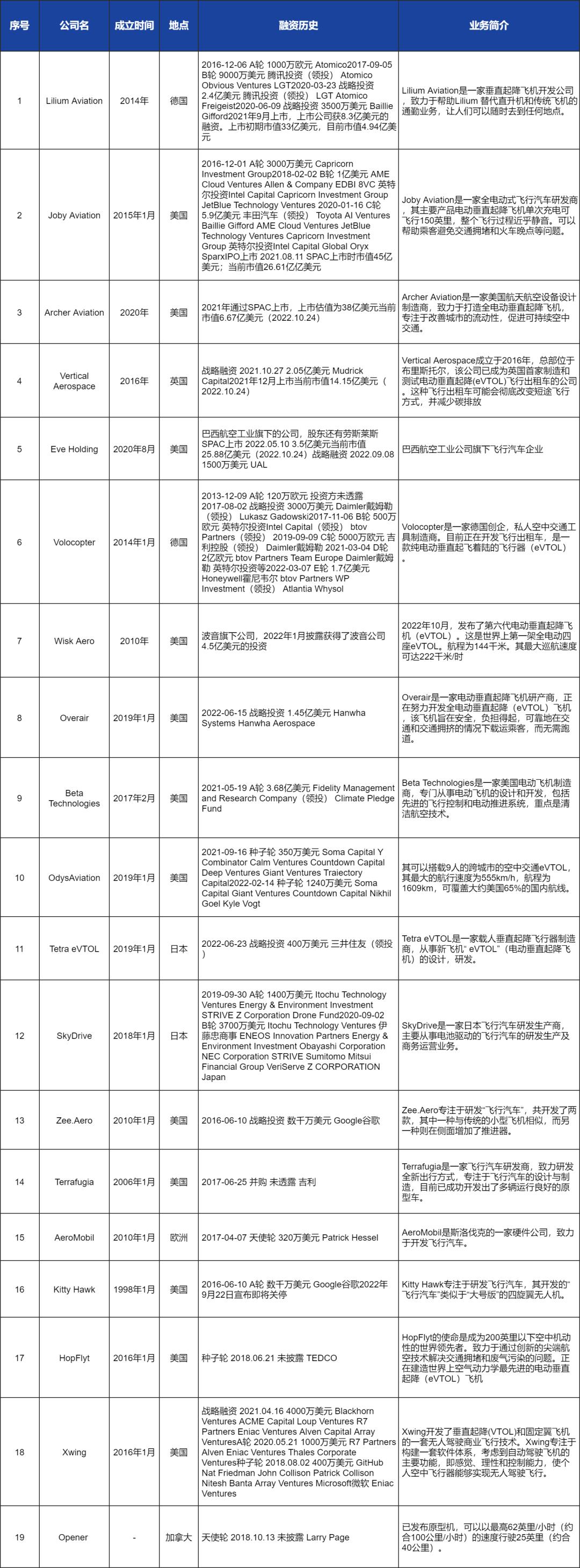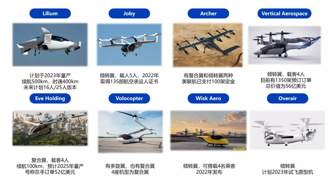 其中上市公司有5家:Lilium Aviation、Joby Aviation、Archer Aviation、Vertical Aerospace、Eve Holding,5家公司在美股的市值总和为78.25亿美元 (根据2022年10月统计) ;其中有4家在2021年上市,1家在2022年5月上市;