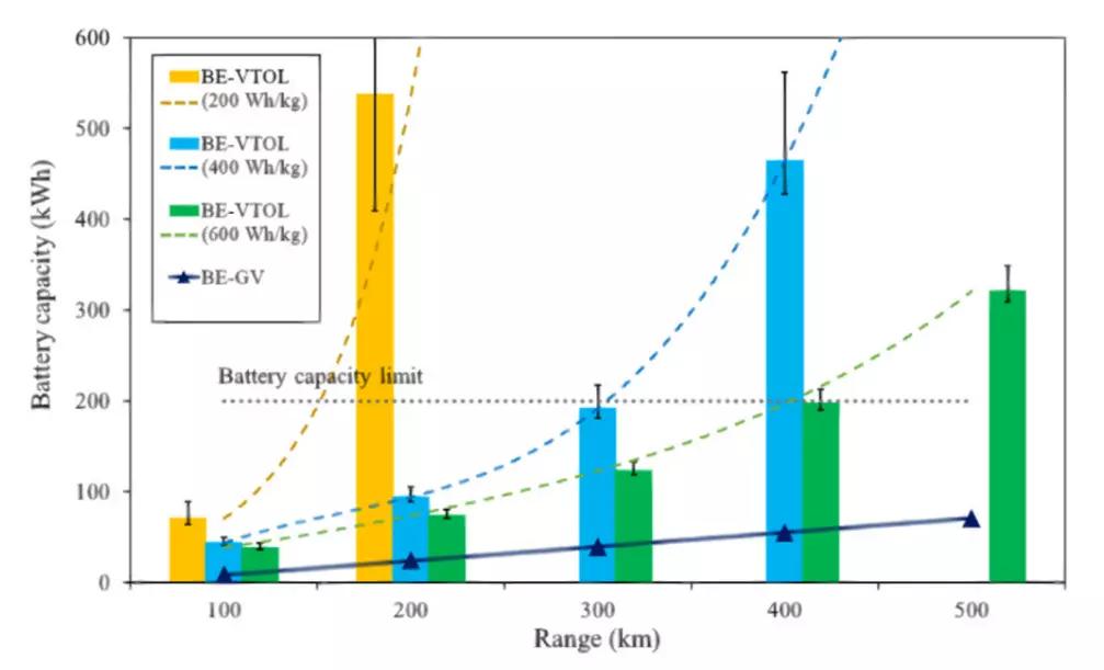 当电池能量密度为200Wh/kg时,飞行汽车续航100km所需电池容量为70kWh,续航200km所需电池容量为537kWh (按照每度电5kg的重量,续航200km需要2.5吨电池,因此不现实) 。
