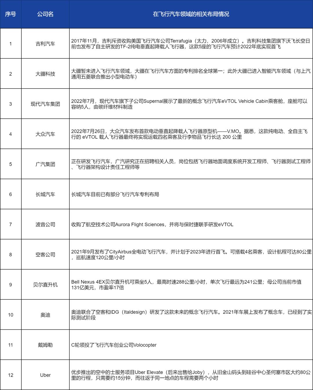 目前国内产业巨头中,量产进展相对领先的是吉利集团,旗下拥有沃飞长空及太力飞行两家公司,在专利布局方面最领先的是大疆科技(虽然并未开始推出相关产品) 。