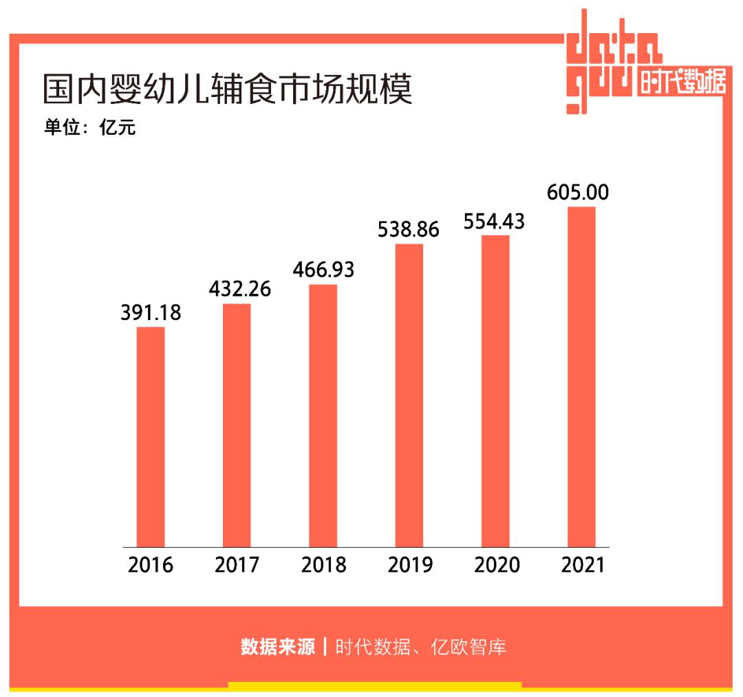 智世代的宝宝们吃出了一个百亿市场,国内婴幼儿辅食市场容量正在不断扩大。亿欧智库的数据显示,2021年,我国婴幼儿辅食市场规模已经达到605亿元。从市场竞争格局来看,目前国内婴幼儿零辅食行业主要分为外资企业,国内老牌企业和国内初创企业三大梯队。
