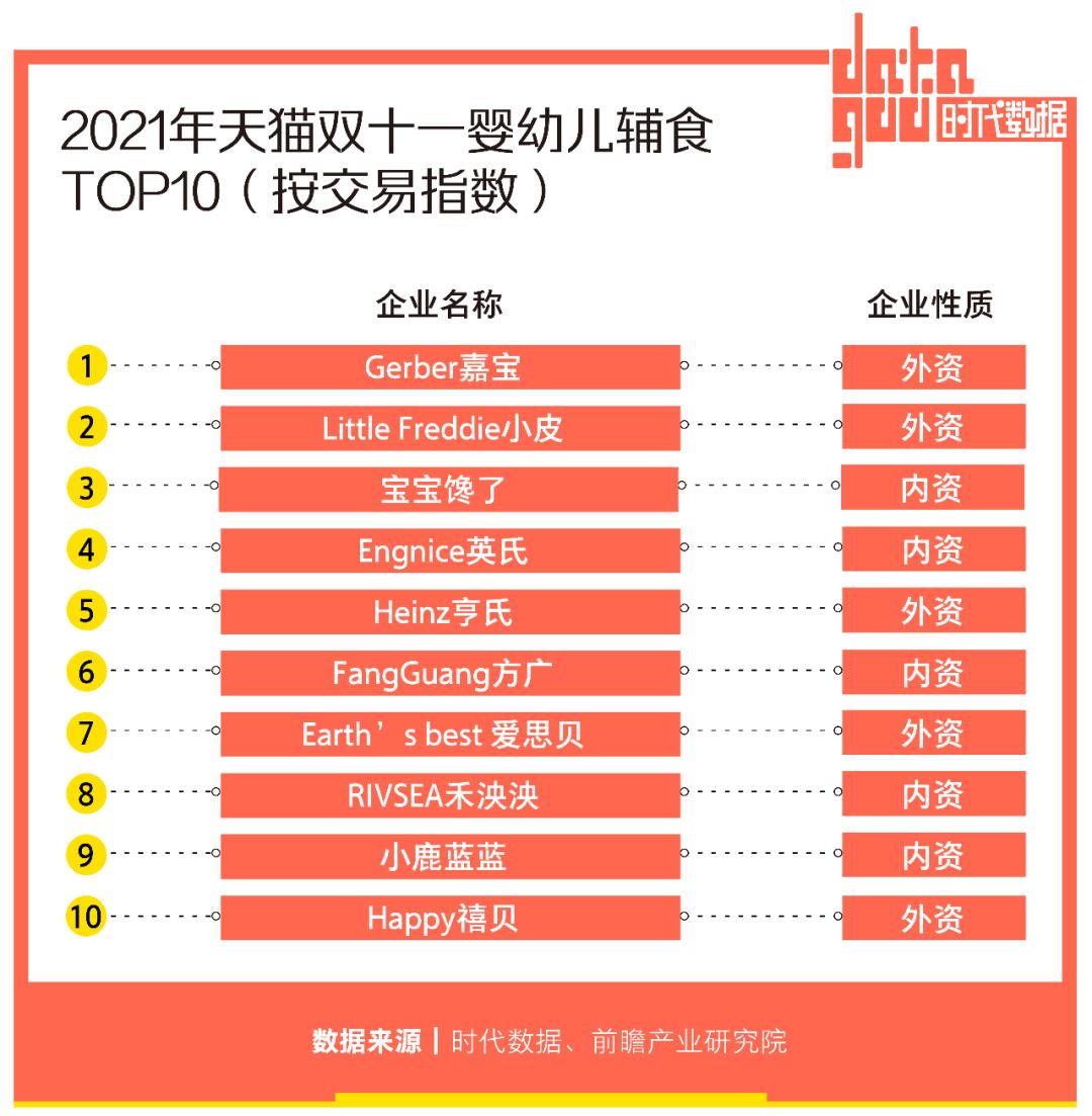 但不可忽视的是,新生代父母对婴幼儿零辅食的需求增长,而受饮食差异限制,现存国外品牌并不能满足家长们的需求,中式零辅食市场存在较大发展空间,国内一众初创品牌正在掀起新一股浪潮。2021年天猫双十一交易数据显示,第一名和第二名为外资企业,而第三名则是国内新锐品牌宝宝馋了。此外,数据显示,2021年上半年,宝宝馋了销售额同比增速超过300%。