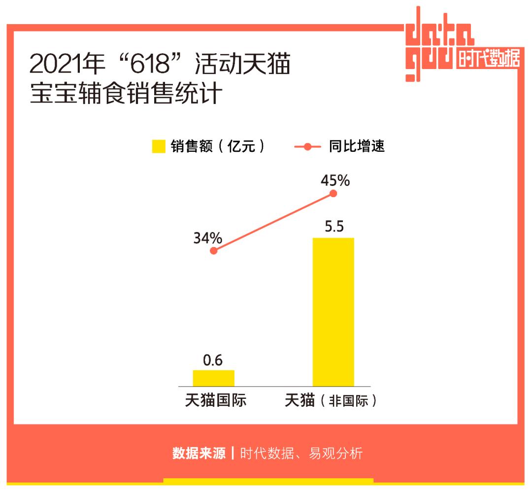 伴随着对精致育儿观念深入和对零辅食的认知加深,新生代父母对婴幼儿零辅食的消费需求也正不断增长。2021年“618”活动期间,天猫宝宝辅食在天猫国际和天猫非国际的销售额范别达到0.6亿元和5.5亿元,同比增速达到34%和45%。