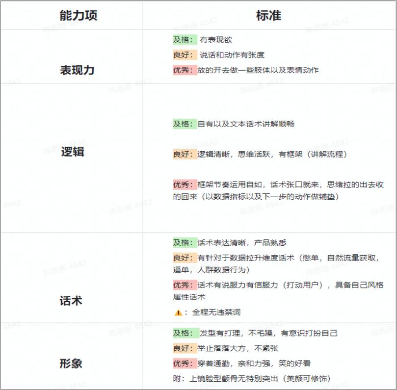比如在杭州这样的城市,主播非常多,水平参差不齐,如何能找到合适的主播来匹配不同的产品呢?这时候就可以建立一套选人标准。