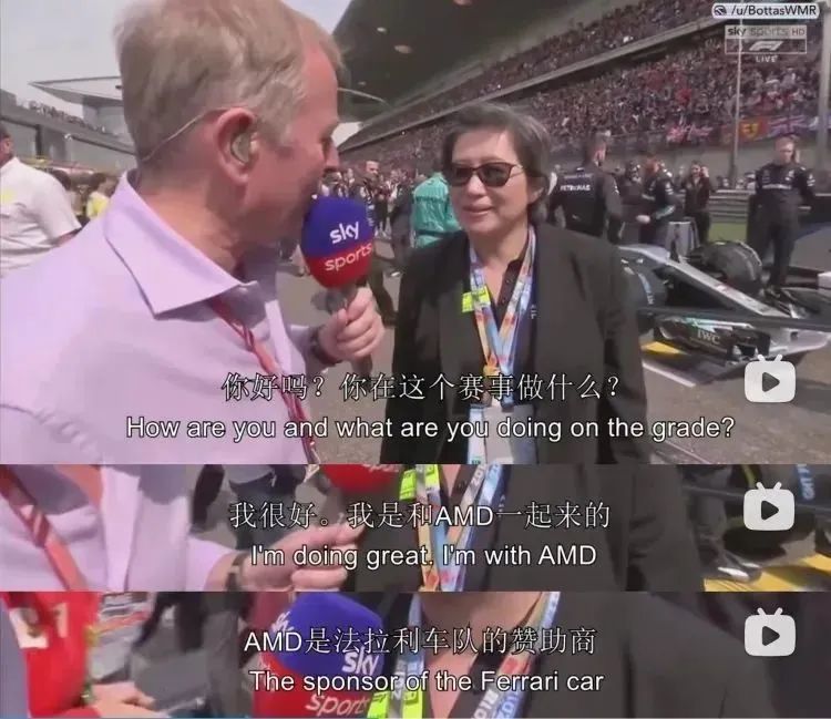 2018年的F1中国大奖赛上,前赛车手、评论员Martin Brundle在现场随机找观众采访,第一个就抓到了同样是以赞助商身份来参加活动的苏妈。
